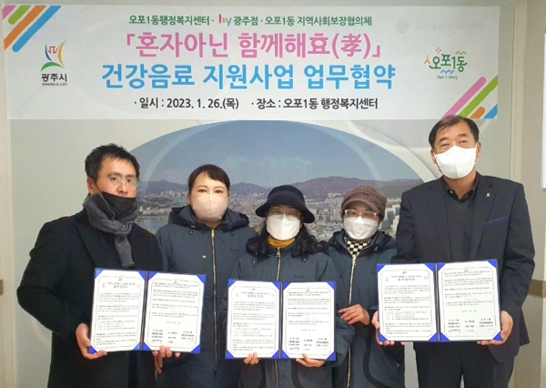[금요저널] 광주시 오포1동 지역사회보장협의체는 지난 26일 한국야쿠르트 광주점과 ‘혼자 아닌 함께해 효’ 건강음료 지원사업에 대한 업무협액을 체결했다.