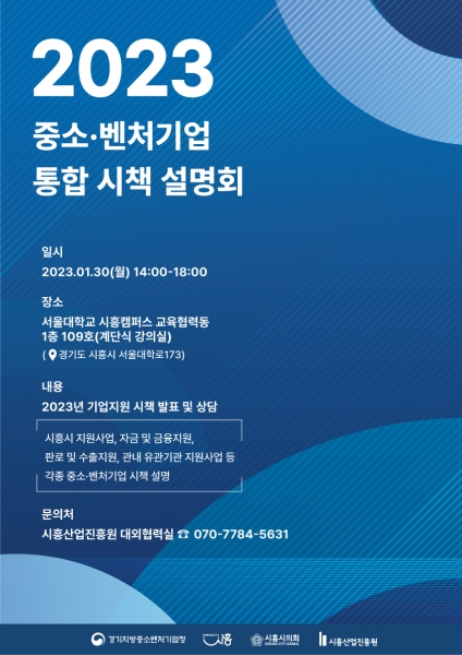 [금요저널] 시흥시는 오는 30일 오후 2시 서울대학교 시흥캠퍼스 교육협력동에서 ‘2023년 중소기업 지원시책 통합 설명회’를 개최한다.