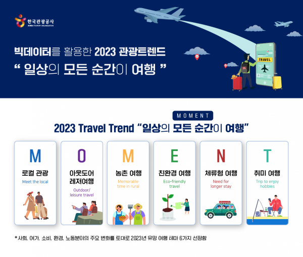 일상 속 개인의 관심사나 취향과 관련된 경험을 추구하며 다양한 테마의 여행을 통해 현재의 행복을 만끽한다는 의미에서 ‘모멘트가 2023년 국내관광 트렌드의 핵심 키워드가 될 전망이다.