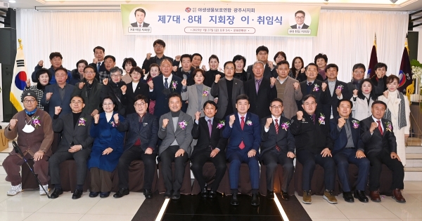 [금요저널] 사단법인 야생생물보호연합 광주시지회에는 지난 27일 문화웨딩홀에서 ‘제7대·8대 지회장 이·취임식’을 개최했다.