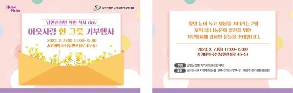 [금요저널] 광주시 남한산성면 지역사회보장협의체는 오는 2월 7일 남한산성면 광지원리에 위치한 송가네막국수에서 ‘남한산성면 착한 식사 Day 이웃사랑 한 그릇 기부사업’을 개최한다고 31일 밝혔다.