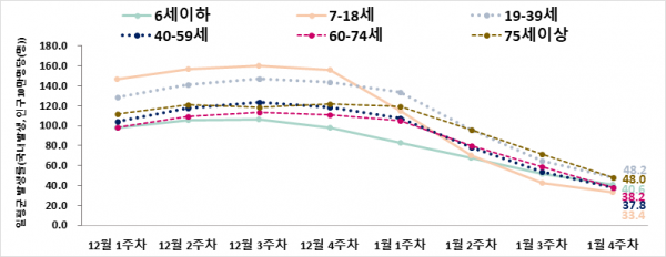 전 연령대에서 전주 대비 일평균 발생률이 감소했다.