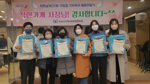 [금요저널] 오산시지역사회보장협의체는 지난 31일 이웃사랑 실천을 위해 수익금의 일부를 정기적으로 기부하는‘착한날개’에 기부 감사를 위한 물품 전달식을 가졌다.