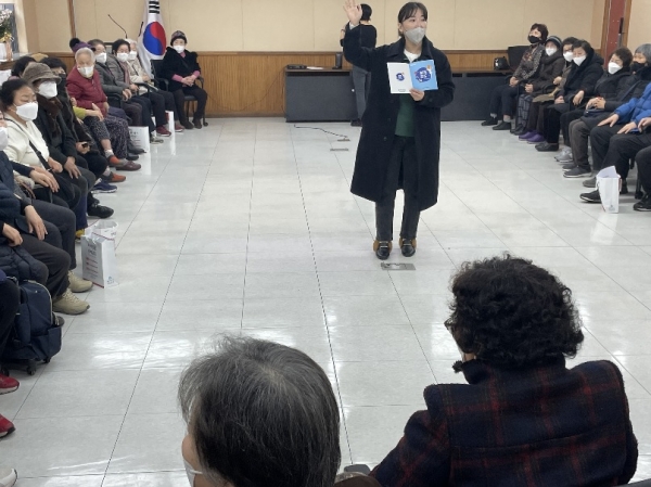 이날 교육은 간호사와 웃음치료사가 방문해 알코올 사용장애 검사지를 작성하고 설문을 바탕으로 건강절주 방법 및 노인의 알코올 섭취 위험성에 대해 교육했다.