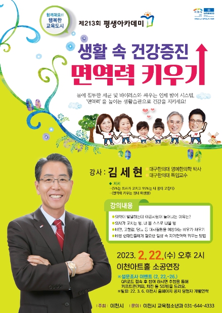 이천시는 오는 2월 22일 오후2시, 이천아트홀 소공연장에서올 해 첫 번째 '제213회 이천 평생아카데미'를 개최한다.