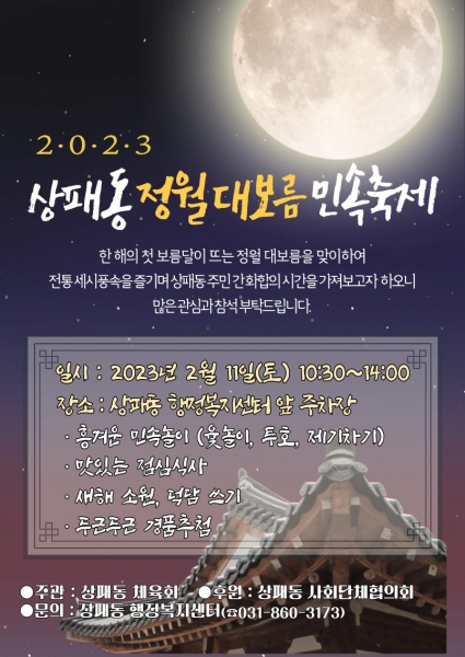 또한 상패동장은 “코로나19 등 오랜 악재를 지나 5년만에 열리는 정월대보름 민속축제인 만큼 상패동 동민뿐 아니라 많은 분들께서 참여하시어 즐거운 하루를 보내시기를 바라며 2023년 모든 주민에게 행복과 번영이 가득하시기를 바란다”고 밝혔다.