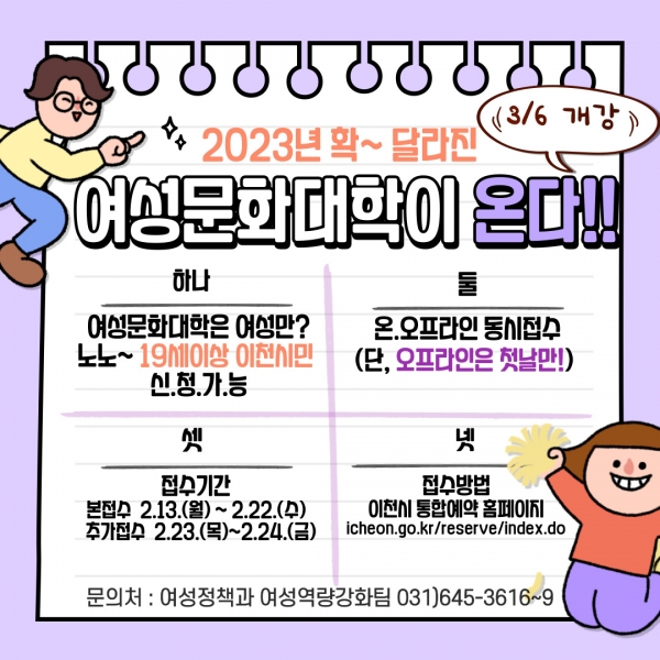 특히 올해는 여성 위주로 신청 가능했던 기존의 제도를 바꾸어 만19세 이상 이천시에 거주하고 있는 사람이라면 누구나 수강 신청이 가능하며 이천시 통합예약 홈페이지를 통한 온라인 선착순 접수와 더불어 접수 첫 날인 2월 13일 월요일에는 컴퓨터 사용에 취약한 시민도 접수가 가능하도록 여성회관 2층 정보화실을 개방하는 등 오프라인 접수를 병행한다.