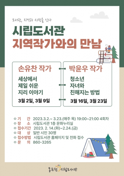 [금요저널] 동두천시 평생교육원 시립도서관은 3월 2일부터 3월 23일까지 매주 목요일에 ‘지역작가와의 만남’을 운영한다고 밝혔다.