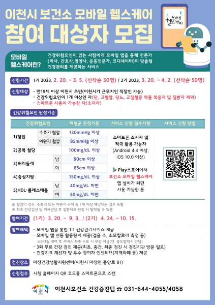 비대면 건강서비스인 모바일 헬스케어사업은 건강위험요인을 1개 이상 보유한 만19세 이상 이천 시민 및 직장이 이천시인 직장인이라면 신청이 가능하다.