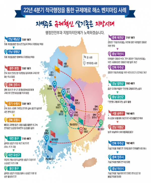 [금요저널] 행정안전부는 지자체가 적극행정을 통해 불합리한 규제를 개선하고 주민의 삶의 질 향상에 기여한 ‘2022년 4분기 적극행정 규제혁신 우수사례’ 7건을 선정했다고 밝혔다.