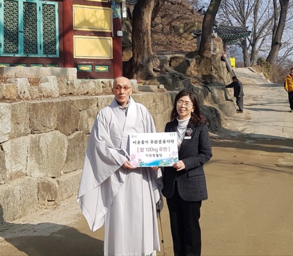 후원에 참여한 영월암 원교 주지스님은 “영월암이 위치한 관고동 관내의 어려운 이웃들을 도울 수 있는 기회가 되어 감사하고 앞으로도 쌀독을 채울 쌀 기부를 꾸준히 이어나가겠다”고 말했다.