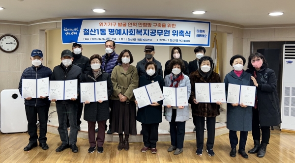 [금요저널] 광명시 철산1동 행정복지센터에서는 지난 9일 3층 강당에서 복지사각지대 없는 인적 안정망 구축을 위한 명예사회복지공무원 위촉식이 열렸다.