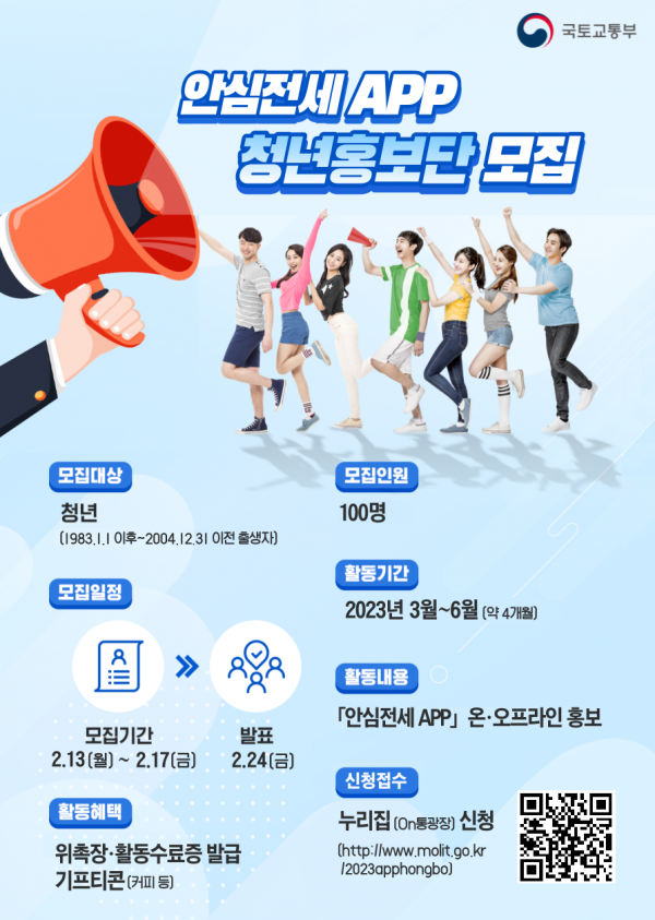 ‘안심전세 App’ 청년홍보단 모집은 2월 13일부터 2월 17일까지 5일간 국토교통부 누리집에서 진행된다.