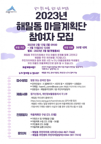 [금요저널] 세종특별자치시 해밀동 주민자치회가 지난 13일부터 다음달 15일까지 주민이 직접 계획하고 만들어 나가는 마을계획을 수립하는 마을계획단을 공개 모집한다.