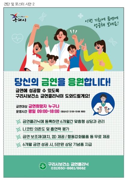 백경현 구리시장은 “개인과 가족, 이웃의 건강을 위해 금연은 선택이 아닌 필수다 앞으로도 흡연자 금연지원서비스 확대는 물론 간접흡연 예방을 위한 금연환경조성에도 최선을 다하겠다”고 전했다.
