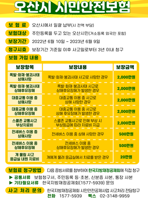 시민안전보험은 오산시가 직접 보험사와 계약하고 보험료 전액을 부담하는 보험으로 일상에서 발생할 수 있는 안전사고로 피해를 입은 시민에게 보험금을 지급해주는 제도이다.
