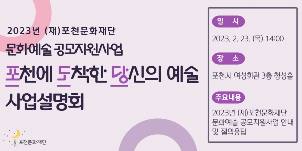 [금요저널] 재단법인 포천문화재단은 오는 23일 포천시 여성회관 청성홀에서 2023년 문화예술 공모지원사업 ‘포천에 도착한 당신의 예술’의 사업설명회를 개최한다.