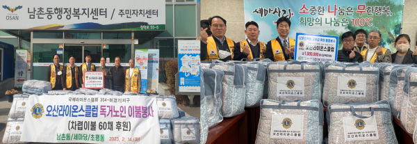 장재흥 오산 라이온스클럽 대표는 “우리의 작은 나눔이 소외된 어르신들에 봄과 같은 따스함과 행복을 드릴 수 있으면 좋겠다”며 “앞으로 더 많은 나눔을 할 수 있도록 힘쓰겠다”고 말했다.