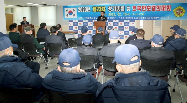 [금요저널] 김정헌 인천시 중구청장이 지난 15일 중구보훈회관 대강당에서 열린 ‘2023년 제23차 6·25참전유공자회 정기총회 및 호국안보결의대회’에 참석해 호국안보와 보훈의 중요성을 거듭 강조했다.