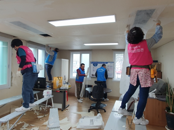 [금요저널] 인천광역시 중구 개항동 지역사회보장협의체는 지난 13일 북성12통 경로당에서 중구여성회관 도배기능사반 수강생들과 함께 도배 및 청소 봉사를 펼쳤다.