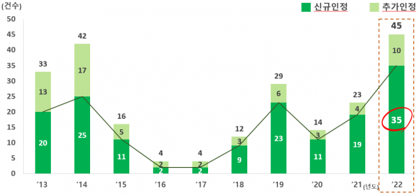 [금요저널] 식품의약품안전처는 2022년 건강기능식품 기능성 원료 인정 현황을 분석한 결과, 인정 원료는 총 45건으로 전년 대비 약 2배 증가했고 이 중 새롭게 인정된 기능성 원료는 35건으로 최근 10년 동안 가장 많은 원료를 인정했다고 발표했다.