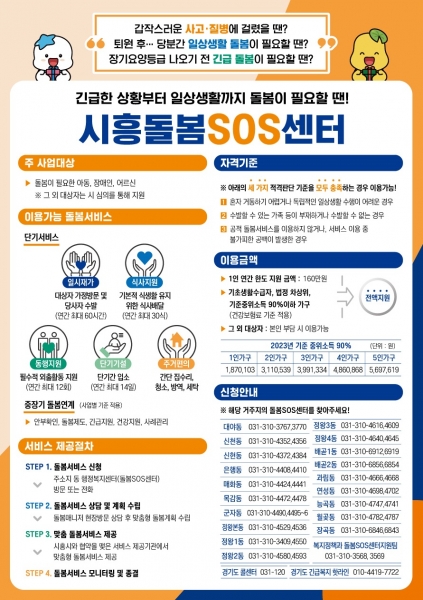 ‘시흥돌봄SOS센터’는 독립적 일상생활이 어렵거나 불가피하게 돌봄 공백이 발생한 시민을 대상으로 10대 돌봄서비스·5대 단기 돌봄서비스)를 제공하는 통합창구다.