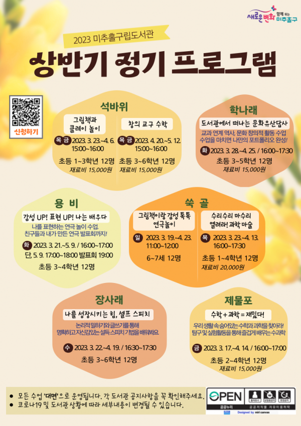 미추홀구립도서관, 2023년 상반기 정기 프로그램 수강자 모집