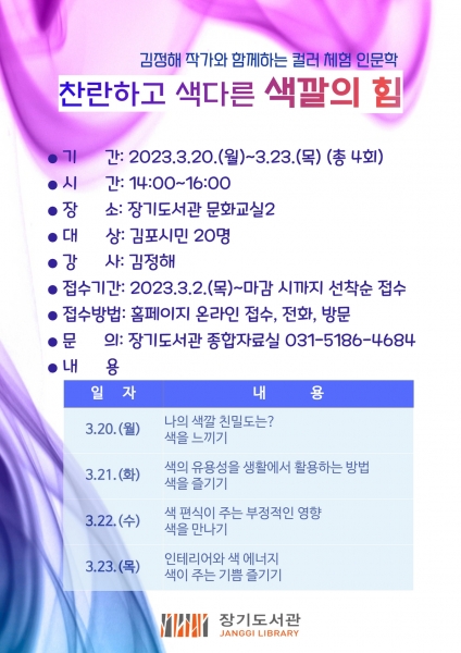 [금요저널] 김포시립 장기도서관은 3월 20일부터 23일까지 나흘간 인문학 프로그램 ‘찬란하고 색다른 색깔의 힘’을 운영한다.
