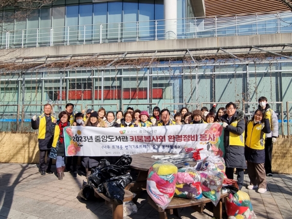 이번 활동은 2023년 도서관 키움봉사회 첫 공식행사로 이날 봉사활동에는 도서관장을 비롯한 도서관 직원들과 관내 공공도서관 키움봉사회원들, 그리고 도서관운영위원회 위원인 이상복 시의원이 함께 참여해 겨우내 도서관 앞 가로수 길에 따뜻함을 입혔던 나무 뜨개옷을 벗기고 도서관 인근 도로의 쓰레기 등을 주웠다.