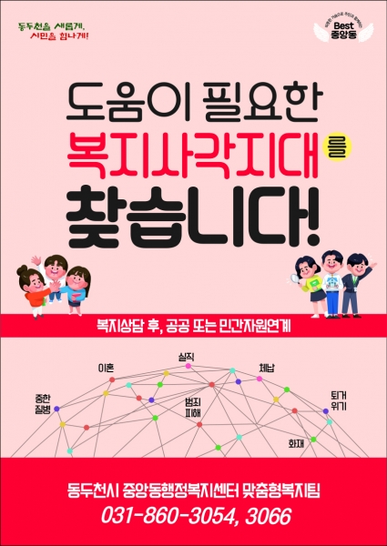 [금요저널] 동두천시 중앙동 행정복지센터는 지난 21일 복지 사각지대 발굴 효과를 높일 수 있는 홍보 포스터를 자체 제작했다고 전했다.