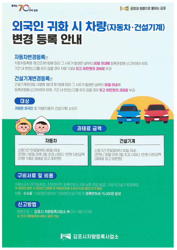 소영만 차량등록사업소장은 “차량 변경등록 신고를 알지 못해 과태료를 납부하는 귀화자들의 불편과 고충이 해소될 수 있도록 홍보를 강화할 것”이라고 말했다.