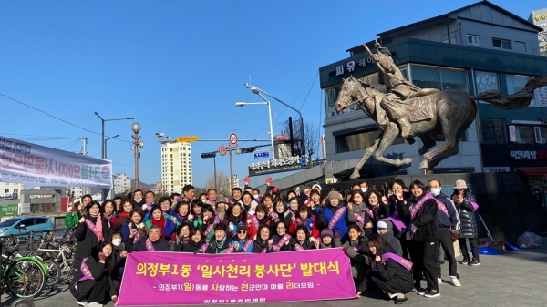 [금요저널] 의정부시 의정부1동주민센터 ‘일사천리 봉사단’은 2월 21일 행복로 이성계 동상 앞에서 발대식을 하고 2월, 오~ 클린데이~ 대청소를 했다.