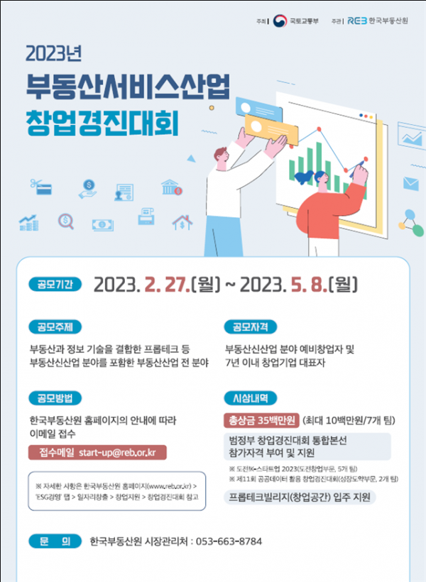 [금요저널] 국토교통부는 부동산서비스산업 분야의 우수한 아이디어를 가진 유망한 새싹기업을 발굴·지원하기 위한 ‘부동산서비스산업 창업경진대회’의 참가자를 2월 27일부터 5월 8일까지 모집한다고 밝혔다.
