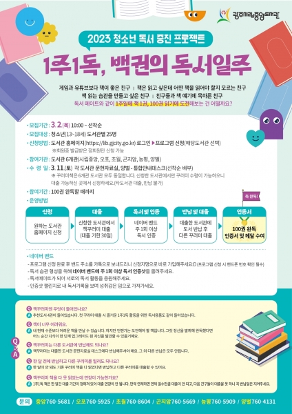 [금요저널] 광주시는 오는 3월부터 청소년들의 독서 증진 및 독서 습관 형성을 위한 ‘1주 1독, 백권의 독서 일주’ 프로젝트를 진행한다고 24일 밝혔다.