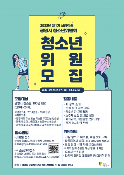 시는 오는 27일부터 3월 24일까지 광명시에 거주하거나 교육·근로 활동하는 만 9~24세 청소년을 대상으로 총 100명 내외의 청소년위원회 참가자를 모집한다.