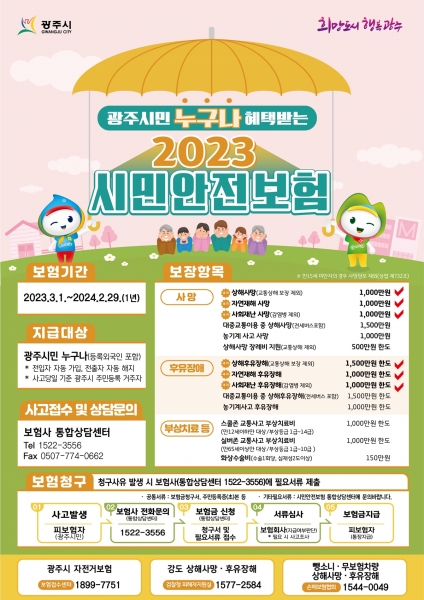 3월 1일부터 개시되는 ‘2023 광주시 시민안전보험’은 상해 사망, 자연재해 및 사회재난 사망에 대한 보장액 1천만원, 후유장해에 대한 보장으로 최대 1천500만원, 상해사망 장례비 지원으로 최대 500만원, 그 밖에 스쿨존 교통사고 부상치료비, 실버존 교통사고 부상치료비, 화상수술비 지원 등 총 14개 항목을 보장한다.