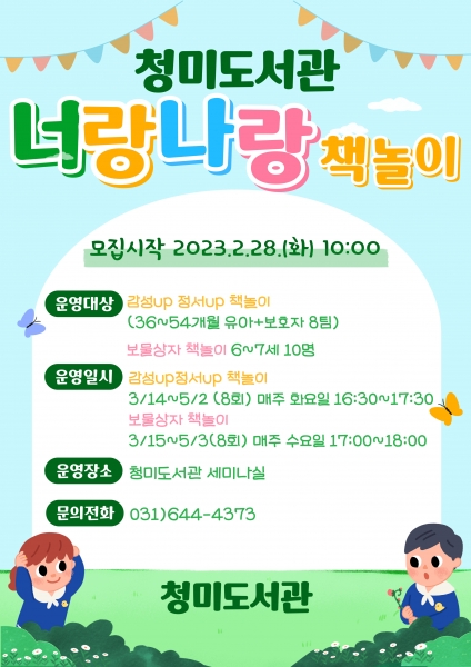 [금요저널] 청미도서관은 푸릇푸릇한 봄을 맞이해 오는 3월 14일부터 북스타트 ‘너랑나랑 책놀이’ 프로그램을 운영한다.