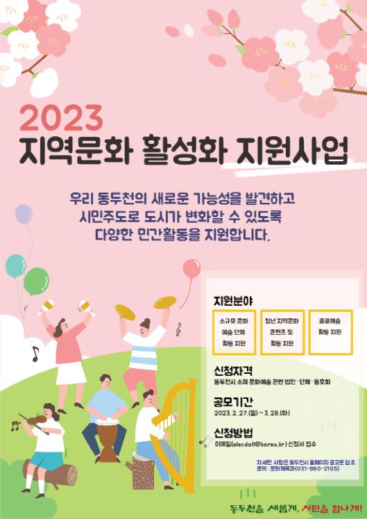 [금요저널] “동두천을 새롭게, 시민을 힘나게”라는 슬로건으로 민선8기 시정운영에 박차를 가하고 있는 동두천시는 시민의 주체적 활동으로 도시의 변화를 이루기 위한 신규 사업으로 ‘2023 동두천 지역문화 활성화’ 공모사업을 추진한다.