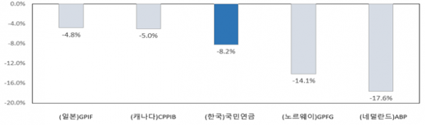 해외 주요 연기금의 운용수익률도 글로벌 증시 급락 등의 영향으로 크게 하락했으며 그 중 국민연금의 성과는 상대적으로 양호한 것으로 나타났다.