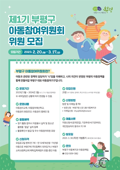 [금요저널] 부평구가 오는 17일까지 아동의 참여권 증진 및 실현을 위한 ‘2023년 제1기 부평구 아동참여위원회’ 위원을 공개 모집한다.