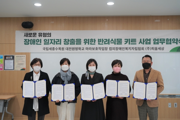 [금요저널] 한국수목원정원관리원은 국립세종수목원이 2일 새로운 유형의 장애인 일자리 창출을 위해 반려식물 키트 제작사업 추진 협약을 체결했다고 밝혔다.