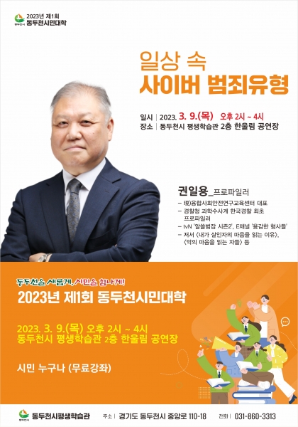 [금요저널] 동두천시는 오는 3월 9일 오후 2시부터 동두천시 평생학습관 2층 공연장에서 융합사회안전연구 교육센터 대표 권일용 강사를 초청해 “일상 속 사이버 범죄유형”이라는 주제로 2023년 제1회 동두천시민대학을 개최한다.