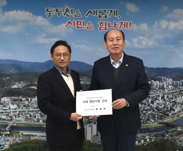 특히 박 시장은 경기북부 반려동물 테마파크 유치 및 조성 등 현안사항에 대한 지원을 요청하는 한편 경기도 차원의 지원이 필요한 동두천시 노인회관 건립 등 3개 사업 대한 예산지원을 건의했다.