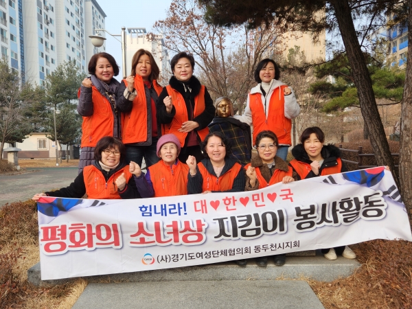 이날 봉사활동에는 동두천시 여성단체협의회 이유화 이임회장, 윤한옥 취임회장을 비롯한 임원진 7명이 참여해 시민평화공원 주변을 정리하고 평화의 소녀상에 따뜻한 담요를 덮어줬다.