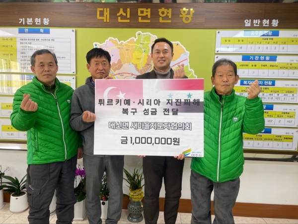 이번 성금은 대신면 새마을지도자회에서 자발적으로 참여한 성금 모금을 통해 마련됐으며 튀르키예와 시리아의 이재민 구호물품 구입 등의 지원과 지진 피해 복구를 위해 사용될 예정이다.