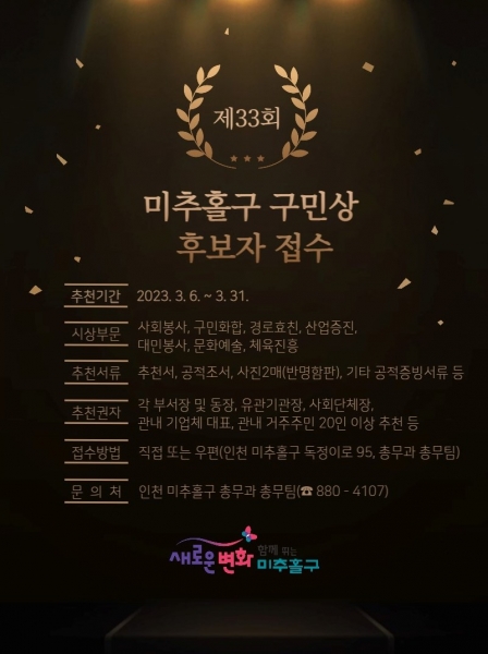 이영훈 미추홀구청장은 “구정 발전을 위해 각 분야에서 묵묵히 헌신해주시는 분들이 귀감이 돼 널리 알려질 수 있도록 적극적인 추천을 부탁드린다”고 말했다.