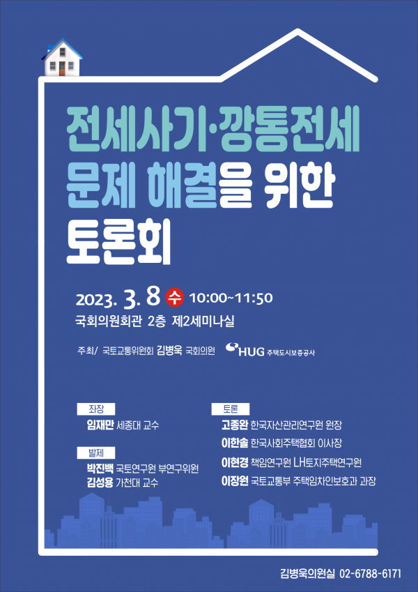 국회 국토교통위원회 소속 김병욱 국회의원은 오는 8일 오전 10시 국회의원회관 제2세미나실에서 ‘전세사기·깡통전세 문제 해결을 위한 토론회’를 개최할 예정이다.