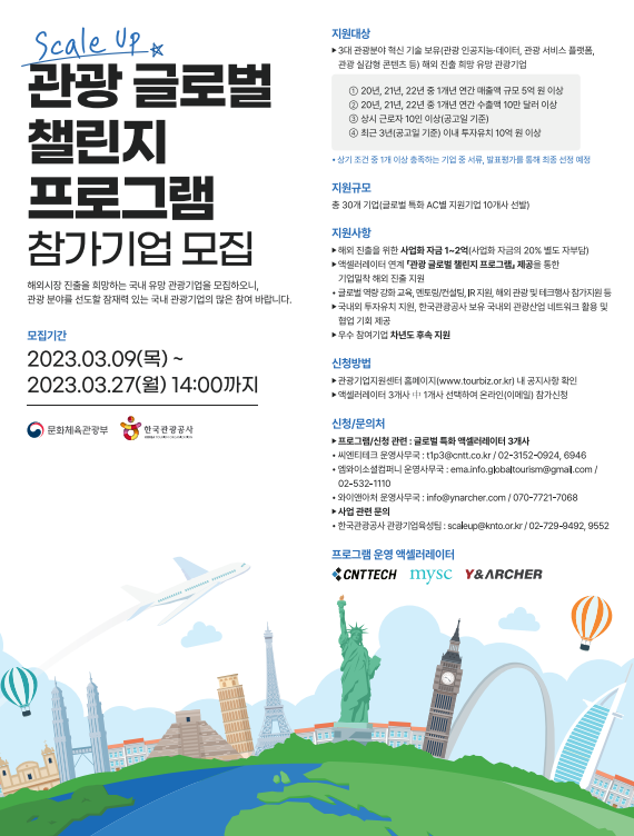 [금요저널] 한국관광공사는 차세대 관광산업을 선도할 혁신 관광기업을 발굴, 육성하기 위해‘2023 관광 글로벌 챌린지 프로그램’에 참여할 기업을 오는 3월 27일까지 공모한다.