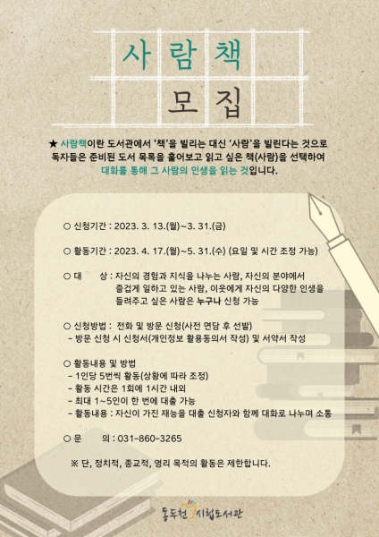 동두천시립도서관에서는 먼저 자신 삶의 지혜와 경험을 나누어줄 ‘사람책’을 8명 내외로 모집한다.