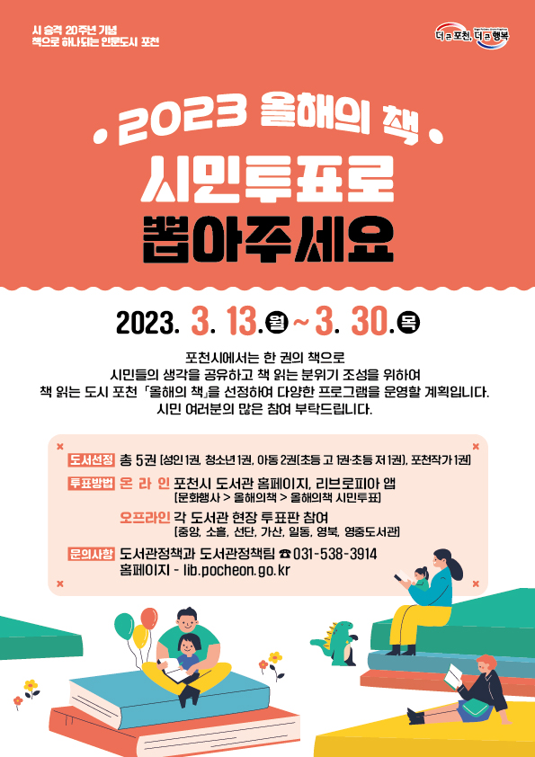 [금요저널] 포천시도서관에서는 3월 13일부터 30일까지 시 승격 20주년을 기념해 1년동안 시민이 함께 읽을 ‘2023년 포천시 올해의 책’ 후보 도서에 대한 시민투표를 진행한다고 밝혔다.